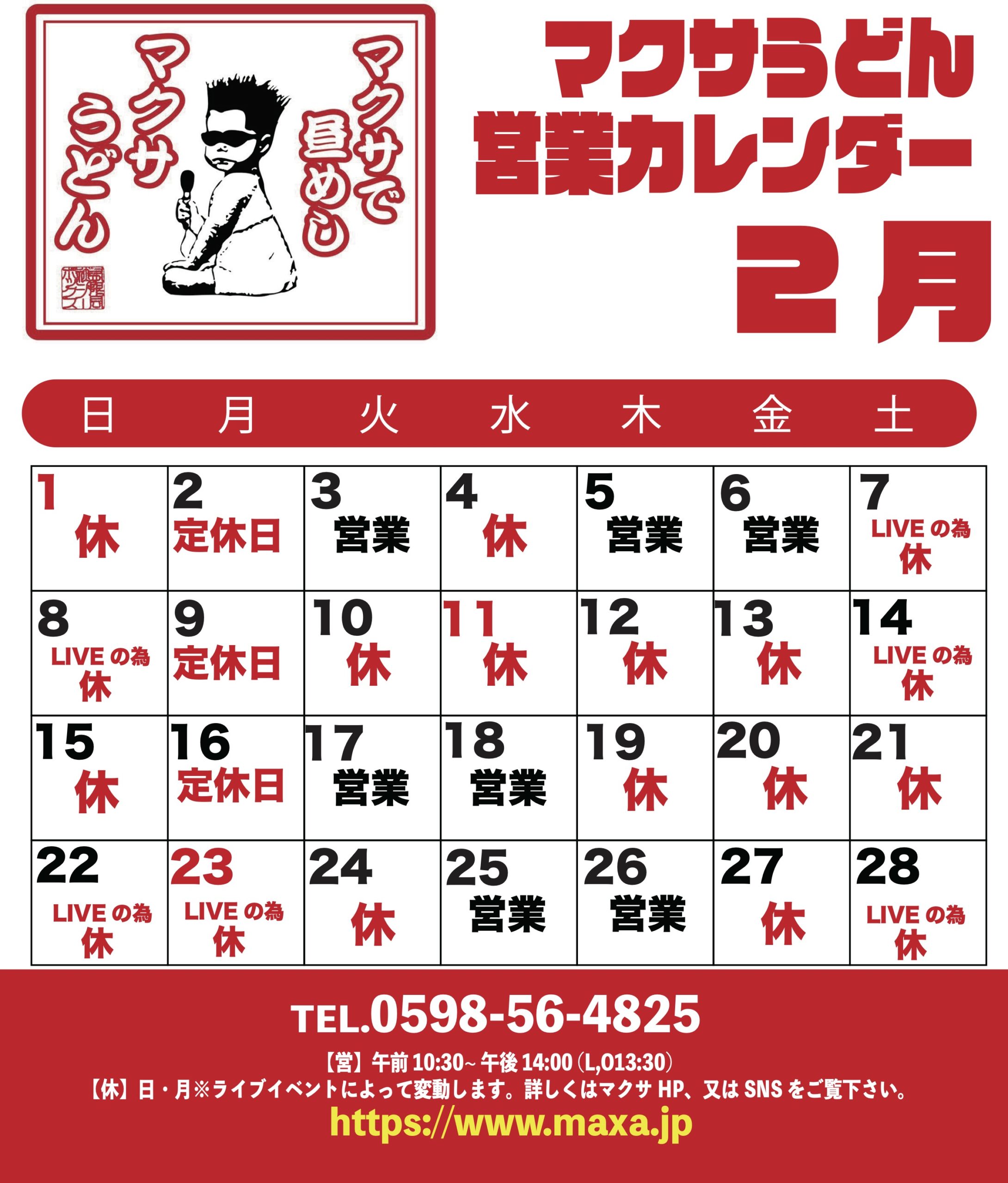 2月のマクサうどん営業カレンダーです。